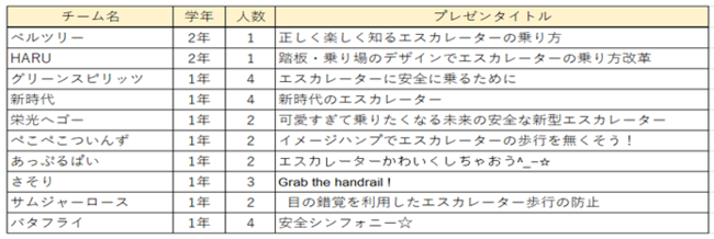 今回10組の応募作品を選定しました。人の心理や行動変容に着目したもの、音や映像の効果を利用したもの、エスカレーターの構造そのものに着目したもの等、どれも高校生らしいアイデアに満ち溢れた作品ばかりです。どうぞ当日は会場で高校生たちの熱意溢れる発表をご覧ください。また、高校生の探求学習の一助になれば幸いです。