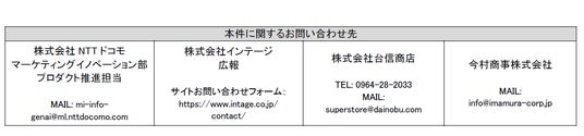 株式会社NTTドコモ(以下、ドコモ)と株式会社インテージ(以下、インテージ)、株式会社台信商店(以下、ダイノブ)、今村商事株式会社(以下、今村商事)の4社は、2024年5月8日(水)から6月28日(金)の期間に実施した「生成AIを活用した店舗内サイネージ向け広告配信に関する実証実験」(以下、本実証実験)において、通常1週間程度かかっていた小売業のサイネージ用広告コンテンツ(以下、広告コンテンツ)作成時間を、生成AIの活用により画像・動画を含め最短で1時間以内とすることが可能となり、合わせて広告対象商品の売り上げを最大で3.3倍増加させる効果を確認いたしました。