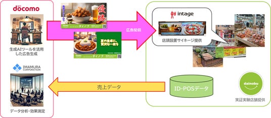 本実証実験では、熊本県および米国でスーパーを展開しているダイノブのスーパーダイノブ城南店において、ダイノブが販売強化を希望する商品のコンテンツをドコモが生成AIを活用して作成し、店内3か所に設置されたインテージのサイネージ端末およびデジタルサイネージ配信システムを通じ、消費者の購買意欲の促進し販売増に繋げる取組みを行いました。また販売結果についてはID‐POSデータ※2を今村商事がダイノブより取得・分析し、その効果について検証を行いました。今回作成したコンテンツでは、生成AIを活用することで作成手順のうち最大で3分の2の工程を半自動化することが可能となり、通常外注すると1週間程度かかる作成時間について、画像・動画の作成を含めて最短で1時間以内に収めることができました。また作成した広告については表示期間(1商品あたり7日間)において平均で1.2倍、最大で3.3倍の売上増加に寄与することが確認できました。今後は秋冬商戦において、2024年10月より第2期として生成AIによる広告生成の品質向上やさらなる自動化に向けた取組みを含めて実証実験を継続し、追加の機能検証として調査対象となる生成AIツールの追加や更なる運用自動化の検討を行い、その結果について効果検証を実施する予定です。今後、インテージは店舗内デジタルサイネージ広告配信のノウハウとマーケティングデータに対する知見を、ドコモは自社が持つ会員基盤を土台にNTTグループが持つ生成AIテクノロジーに対する知見を、今村商事はID-POS分析に関する知見を元に、スーパーの売り場づくりのノウハウを持つダイノブと協力し、日本のマーケティング市場に適した店内サイネージ広告の自動生成ソリューションの開発を推進してまいります。