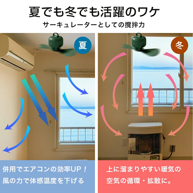 これからのキャンプシーズンは暖房機器と共に行っていくことになりますが、天上扇風機の上方から吹き降ろす攪拌能力は暖房機器の効率アップができます。