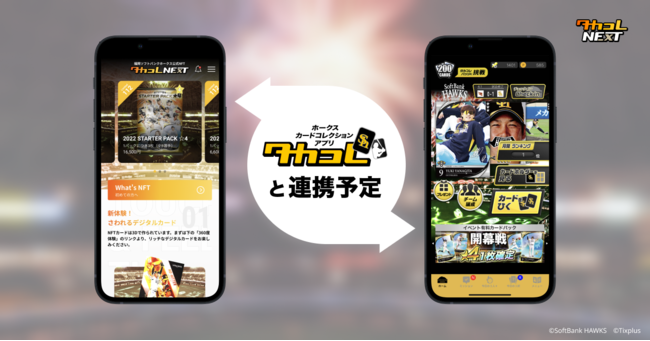 「タカコレNEXT」では、臨場感溢れる試合での写真のほか、公式サービスならではの貴重なショットを使ったNFTカードを展開する予定です。また、公式カードコレクションアプリ「ホークスカードコレクション・タカコレ」のデジタルカードもNFTとして「タカコレNEXT」で販売します。「ホークスカードコレクション・タカコレ」のカードが、NFTの技術によって実物のカードと同じように一枚一枚の価値を証明できるようになります。さらに、「ホークスカードコレクション・タカコレ」内でのカードを使った予想ゲームやマイチームの設定、タカコレホルダーとの連携なども予定しています。