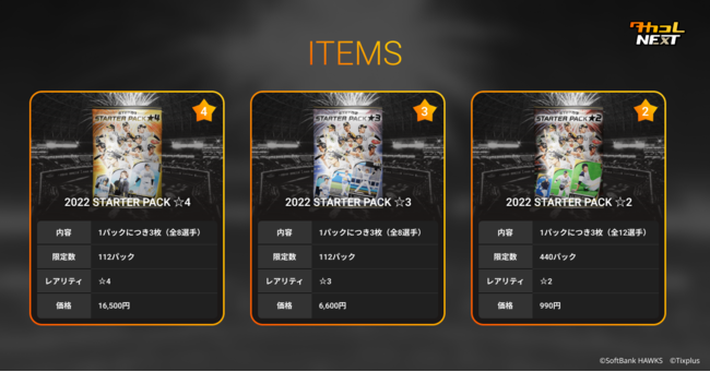 6月10日(金)からNFTカード3枚入りパックの販売も開始されます。「2022 STARTER PACK」と題して、レアリティごとに分かれた選手カードを期間、数量限定にて販売いたします。選手カードは全てシリアルナンバー付きで、1枚1枚が固有で独自のNFTカードとして扱われます。