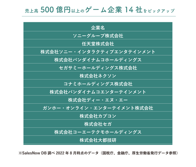 売上500億円以上のゲーム会社14社から一部企業をピックアップ