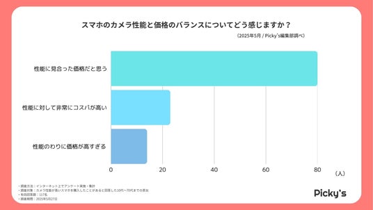 アンケート結果によると、スマホのカメラ性能と価格のバランスについて「性能に見合った価格だと思う」と回答した人が最も多く、全体の約7割(80件)を占めました。