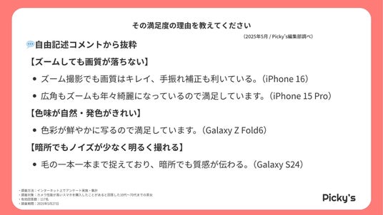 アンケート回答から、スマホカメラに満足している理由として多く挙がったのは、「ズームしても画質が落ちにくい」「色味が自然」「暗所に強い」「手ブレが少ない」といった要素でした。
