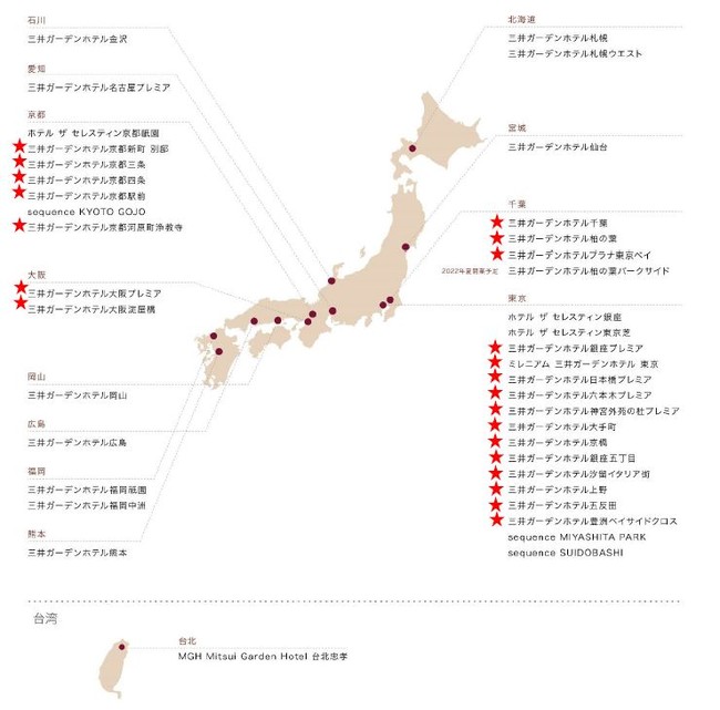 三井不動産ホテルマネジメントは、現在、アッパーミドルクラスの宿泊主体型ホテルである「三井ガーデンホテルズ」を32施設、ハイクラスの宿泊主体型ホテルである「ザ セレスティンホテルズ」を3施設、次世代型新ホテルブランド「sequence(シークエンス)」を3施設の国内38施設、「MGH Mitsui Garden Hotel 台北忠孝」の国外1施設を運営しています。今後も「記憶に残るホテル」「感性豊かなお客様の五感を満たすホテル」という理念・コンセプトのもと、ホスピタリティ溢れるサービスを提供してまいります。