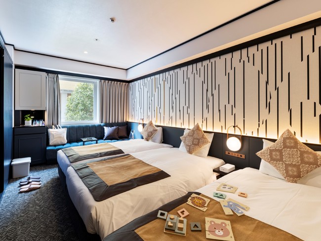 ファミリーでのご利用に最適な常設ベッドを3台配したお部屋に、お子様がお愉しみいただける玩具やらくがき