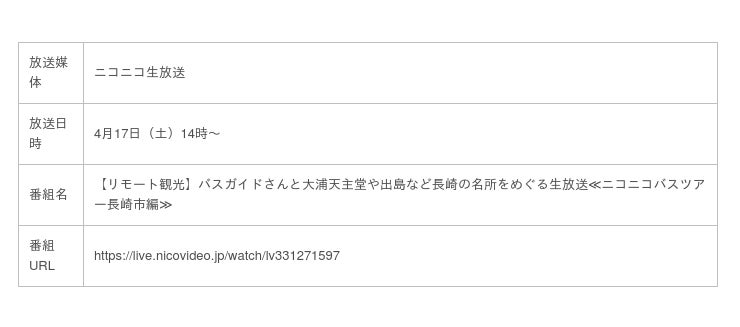 ニコニコでは、緊急事態宣言下の2020年5月から、不要不急の外出が制限されている中、自宅にいながら旅行を楽しめる「ニコニコバスツアー(https://ch.nicovideo.jp/niconicobustour)」を全国各地の自治体や事業者のご協力のもと実施してきました。2020年11月に行われた石川県小松市のリモート観光では、来場数69,000を超える多くの方に視聴いただき、バスからの映像に加えドローン空撮による迫力のある映像と共に魅力を伝えることができました。また、2021年2月6日に実施した、「オンラインさっぽろ雪まつり」バスツアーでは札幌観光協会と、札幌観光バスのご協力のもと、雪像を見学したり、テレビ塔や円山動物園など札幌の観光地も訪れ、合計約30000人の方に視聴して頂きました。番組では、感染拡大のリスクを避けるため、リモート配信は最小限の人員で行い、撮影中もバス内の窓を開放して実施をしております。