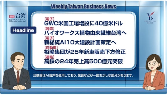 台湾に拠点を置き、各種コンサルティング、リサーチ、日本人向け台湾経済ニュース、クラウドサービスの提供などを行う情報サービス企業グループ「ワイズコンサルティング」は、このたび、台湾の最新ビジネス情報を動画でわかりやすくお届けするYouTube番組「週刊台湾ビジネスニュース」の配信を開始いたしました。