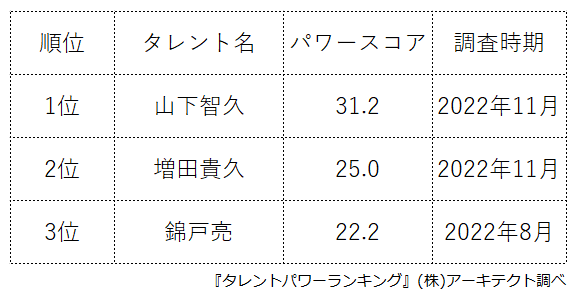本ランキングは、2022年11月度に実施したタレント調査データ(一部過去実施データ)を利用し、タイトルに応じてランキング形式でまとめたものです。