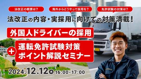 「働く」に関する社会課題をビジネスで解決するキャムコムグループの株式会社天職市場(本社:東京都新宿区、代表取締役:春名敬太 、以下:天職市場)は2024年12月12日(木) 16:00よりオンラインセミナー『法改正の内容・実採用に向けての対策満載! 外国人ドライバーの採用+運転免許試験対策ポイント解説セミナー』を開催いたします。