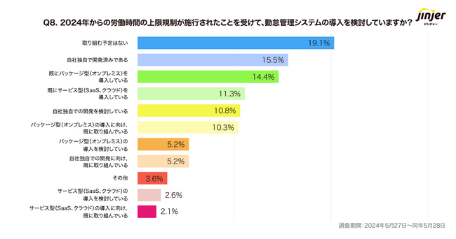 「法改正へ対応にあたって、勤怠管理システムの導入を検討しているか?」を質問したところ、「パッケージ型(オンプレミス)」を導入または検討しているという回答は計29.9%、「サービス型(SaaS・クラウド)」は計16%、「自社独自の開発」は計31.5%という結果になりました。