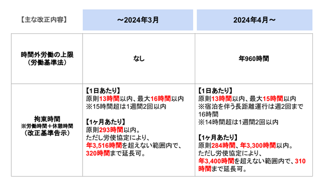 2024年4月から「働き方改革関連法」に基づいて、自動車の運転業務の時間外労働についても「年960時間(休日労働含まず)」の上限規制が適用されます。併せて、トラックドライバーの拘束時間を定めた「改善基準告示(貨物自動車運送事業法に基づく行政処分の対象)」により、拘束時間等も強化されます(※)。