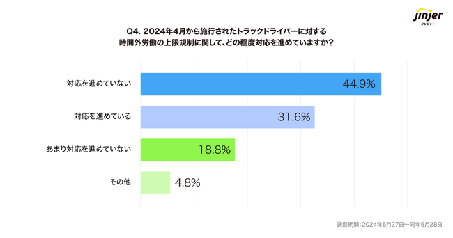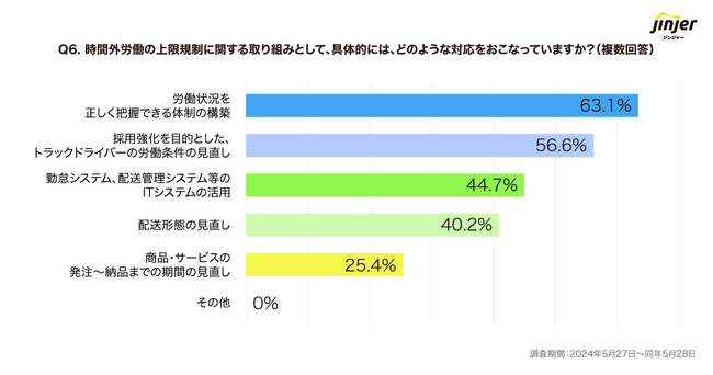 Q4で「対応を進めている」と回答した企業を対象に、「具体的な取り組み内容」について質問したところ、「労働状況を正しく把握できる体制の構築(63.1%)」「採用強化を目的とした、トラックドライバーの労働条件の見直し(56.6%)」「勤怠システム、配送管理システム等のITシステムの活用(44.7%)」という結果になりました。