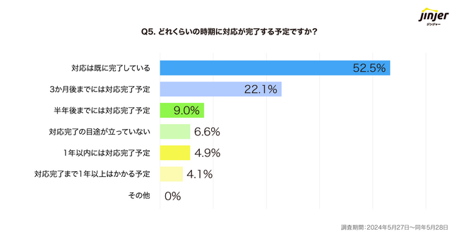 Q4で「対応を進めている」と回答した企業を対象に、「対応が完了する目安時期」について質問したところ、52.5%の企業が「対応は既に完了している」と回答。次いで、「3か月後までには対応完了予定(22.1%)」、「半年後までには対応完了予定(9.0%)」、「1年以内には対応完了予定(4.9%)」と、合わせて約36%の企業が1年以内に対応完了予定という結果になりました。