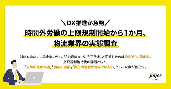 クラウド型人事労務システム「ジンジャー」を提供しているjinjer株式会社(本社:東京都新宿区 代表取締役社長:桑内 孝志 以下、jinjer)は、人事担当者の計274名を対象に、「時間外労働の上限規制開始から1か月、物流業界の実態調査」を実施しました。