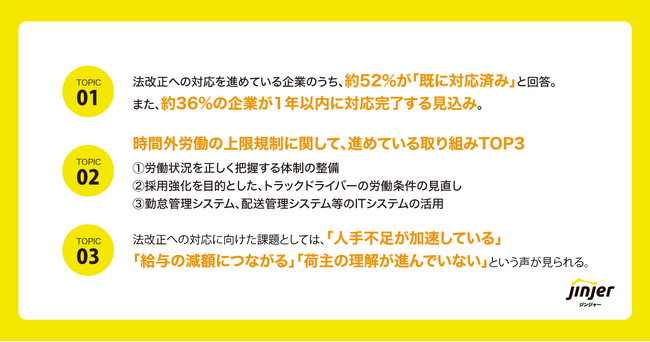 また、法改正への対応を進める上での課題について、自由記述で質問したところ、「人手不足が加速している」「給与の減額につながる」「荷主の理解が進んでいない」という声が挙げられました。