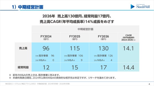2026年売上高130億円、経常利益17億円、売上高CAGR(2023-2026年平均成長率)14%成長をめざす