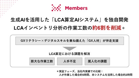 デジタルビジネス運用支援で企業の脱炭素DXを推進する株式会社メンバーズ(本社:東京都中央区、代表取締役社長:高野 明彦、東証プライム:2130、以下「メンバーズ」)は、生成AIを活用した「LCA算定AIシステム」を独自開発し、本システムの導入から運用・定着までをGX人材が伴走支援することによる、企業のLCA算定の効率化および内製化支援を開始します(※1)。これにより、企業のLCA算定における膨大な作業工数、人手不足、属人化などの課題を解消します。