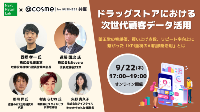 株式会社アイスタイル(代表取締役社長 兼 CEO:吉松徹郎)は、2022年9月22日(木)に、Next Retail Labフォーラム×@cosme for BUSINESS 共催となるウェビナーイベント『ドラッグストアにおける次世代顧客データ活用~薬王堂の客単価、買い上げ点数、リピート率向上に繋がったKPI重視のAI肌診断活用とは~』を開催することをお知らせいたします。