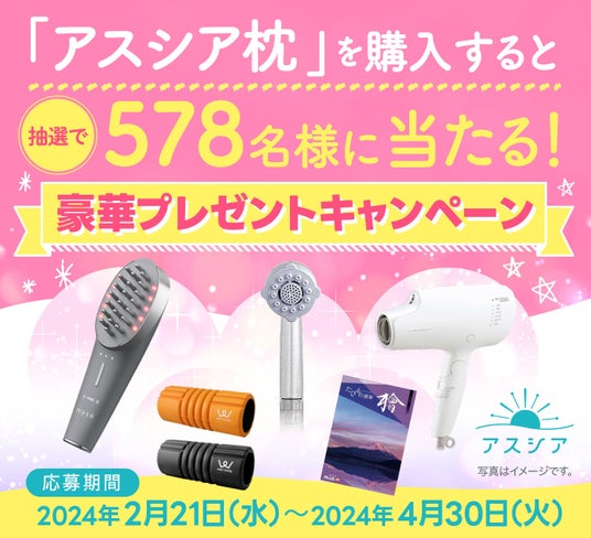 アスシアでは、同日2024年2月21日(水)から2024年4月30日(火)まで総計578名様に豪華景品が当たる「アスをシアわせに!モチベUP!アイテム プレゼントキャンペーン」を実施。新生活がはじまるこの時期にアスシア枕で睡眠時間を見直しませんか?