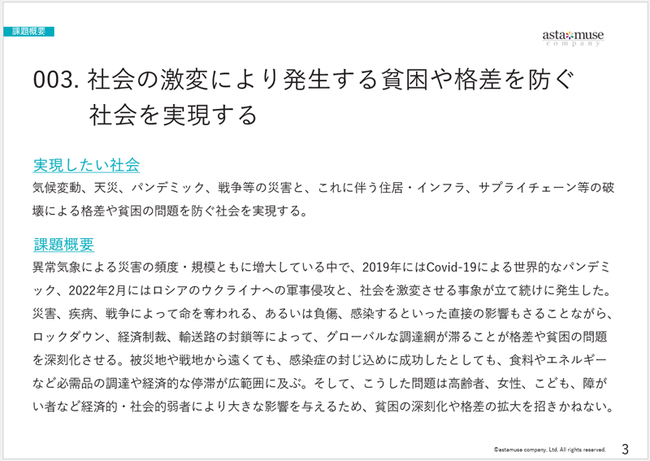 アスタミューゼ株式会社(本社:東京都千代田区、代表取締役社長 永井歩)は「2022年度版社会課題俯瞰レポート」の提供を開始します。2020年にリリースしたレポートに最新データと社会情勢を加味してアップデートしたものとなります。経営企画、サステナビリティ、R&D、事業開発などの部門のご担当者様が知っておくべき新たな社会課題の概要、そのインパクト、解決策となるテクノロジーなどをまとめてご提供します。