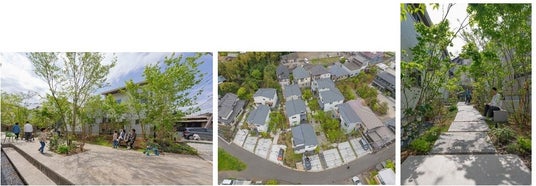 緑豊かであったこの土地に里山のような風景を生み出せないか、という想いからスタートしたプロジェクト。南雛壇の高低差を活かして境界は法面でシームレスに設定し、住宅ゾーン(歩)と駐車ゾーン(車)を分離させました。8 棟の住宅を一定の距離を置いて配置することで生まれた余白へ 200 本以上の木々を植え、さらに、地役権を設定することで散策の路【園路】、木陰が映る【広縁】、集まって語らえる【くつろぎの縁】を設け、住人が共用できるスペースとしました。