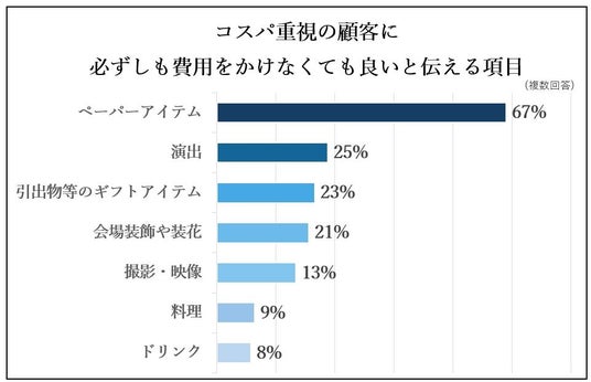 『コスパを重視する顧客に、費用をかけた方が良いと勧めているもの』には、「料理(40 %)」「撮影・映像(27%)」と回答したウェディングプランナーが全体の70%弱にのぼります。一方、『必ずしも費用をかけなくても良いと伝える項目』として、最も多く挙がったのは「ペーパーアイテム(67%)」。準備の効率化やおふたりとゲストの利便性などもあわせて考慮し、WEB招待状&席次表を勧めると多くのウェディングプランナーが回答。おふたりの希望やこだわりをふまえつつ、ゲストの満足度に直結する料理と、結婚式後も長く楽しめる撮影・映像を中心に、費用をかけるポイントと優先順位付けについてアドバイスをしていることが分かりました。