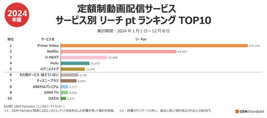 エンタテイメント業界に向けたデータ×デジタルマーケティングサービスを提供するGEM Partners株式会社(ジェムパートナーズ、所在地:東京都港区、代表取締役:梅津文)は、映像、マンガ・書籍、ゲーム、音楽メディアなどのメディアを横断してエンタメブランドの真のリーチを比較・評価することを目指した新指標“リーチpt※1”をもとに、2024年の「定額制動画配信サービス 年間視聴ランキング」を発表いたします※2。メディア横断をはじめ、これまで把握が難しかったサービス横断での真のリーチを明らかにすることを目的としています。