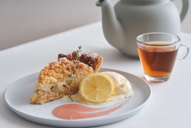 バターでじっくりとソテーした“岡山白桃”の旨味を贅沢にギュッととじこめたパイ。クランブルのサクほろ感がアクセントに。ひんやり冷たいバニラアイスが温かいクランブルパイと相性抜群です。