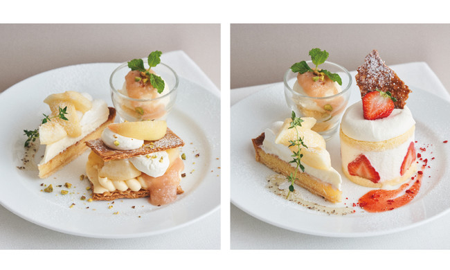 ■(左)“岡山白桃”のミルフィーユとレアチーズムースタルトの桃づくしデザートプレート(税込1,540円)