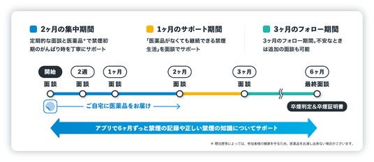 当プログラムは、看護師や薬剤師などの医療資格を持ち、さらに育成プログラムを経て専門知識を持った指導員が丁寧にオンライン面談を行います。加えて専用のアプリからも365日参加者個人に合わせたアドバイスを提供し、薬では対処しにくい心理面においても手厚いサポートが可能となります。また、禁煙の失敗(再喫煙)が多いとされる3~6ヶ月の期間を長期的に支援することにより、プログラム終了後における禁煙継続にも寄与します。