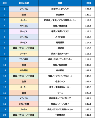 上昇率1位の「医療コンサルティング」は、医療機関からの経営コンサル需要が増え25%以上アップ。