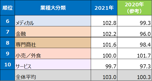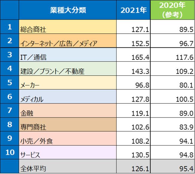 次いで上昇率が高かったのは、コロナ禍で業績好調なWebサービス・Webマーケティング企業が含まれる2位「インターネット/広告/メディア」で約7%上昇しています。3位の「IT/通信」は、オンライン化・DX化でニーズの高まりを受け、約5%アップしました。