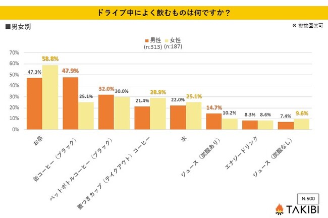 今回のアンケートでは、ドライブ中には主にお茶やコーヒーなどを飲む方が多いことが分かりました。前回行った運転中の眠気対策に関するアンケート結果(https://prtimes.jp/main/html/rd/p/000000232.000018246.html )からも分かる通り、カフェインの含まれるお茶やコーヒーなどを眠気対策として意識的に飲まれているのかもしれません。
