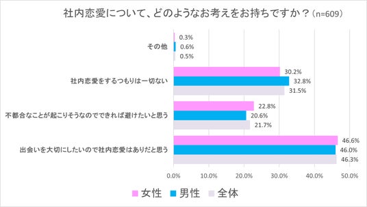 「結婚相手紹介サービス」株式会社オーネット(本社:東京都中央区、代表取締役社長都村毅、以下オーネット)は、全国の25~34歳の独身男女609人(男性:311人、女性:298人)に対して、「独身男女の社内恋愛に関する意識調査」を実施いたしました。