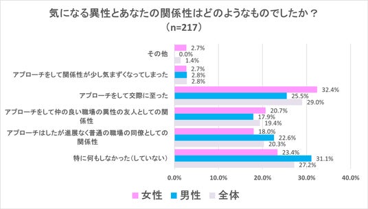 この設問では、「気になる異性がいた」と回答した方に、「その異性との関係性はその後にどのようになったか?」をうかがってみました。回答割合で最も多かった回答は「アプローチして交際に至った」が全体で29.0%という結果で、男性25.5%、女性32.4%と男性より女性の方が多い回答割合となりました。逆に「特に何もしなかった」という回答した割合が全体で27.2%となり、男性31.1%、女性23.4%という結果となり、男性の方が女性よりも消極的であることがうかがえる結果となりました。また、アプローチをして交際までには至らなかったものの、「職場の同僚として普通の関係性」が全体で20.3%、「職場で異性の良い友人としての関係性」が全体で19.4%という回答割合となりました。