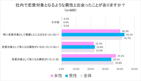 この設問への回答結果から、男女の3人に一人は職場で気になる異性との出会いがあり、逆に5人に一人は気になる異性との出逢いがないということがわかります。