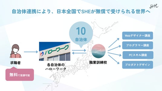 今後、国との連携による補助金獲得で受講のハードルを下げ、自治体との連携により地域の賃金・就労格差を解消し、これまで以上に多くの方にSHEのサービスを届けることを強化していきます。