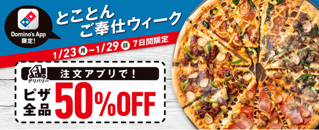株式会社ドミノ・ピザ ジャパン(代表取締役:ジョシュア・キリムニック、CEO:マーティン・スティーンクス、本社:東京都品川区、以下:ドミノ・ピザ)が展開する国内No.1シェアを誇る宅配ピザチェーン ドミノ・ピザは、2023年1月23日(月)から1月29日(日)までの7日間、「ドミノ・ピザ注文アプリ」限定で、どのピザ、どのサイズでも、ピザ全品がデリバリー半額(50%オフ)になる「とことんご奉仕ウィーク」を実施します。この期間中、全国47都道府県のドミノ・ピザ全957店舗(※)で、お客様にいつもおいしい、アツアツのピザを召し上がっていただけるよう、デリバリー時間の短縮や顧客満足度の向上に全店あげて取り組み、お客様にとことんご奉仕します。1月16日から販売を開始した新商品「バーガーピザ」シリーズを含め、常時35種類以上ご提供しているピザをおトクに、アツアツに、おいしく楽しめる機会です。ぜひご利用ください。