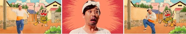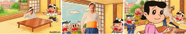 バカボンのパパと瓜二つな腹巻、はちまきを身に着け、ヒゲメイクをした千鳥 大悟さんによる「スモカボン」と、「天才バカボン」のキャラクターたちのユニークな掛け合いも是非お楽しみください。