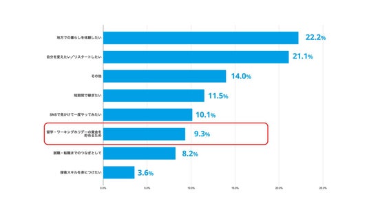 一方で「留学・ワーキングホリデーの資金を貯めるため」という目的も一定数見られました。
