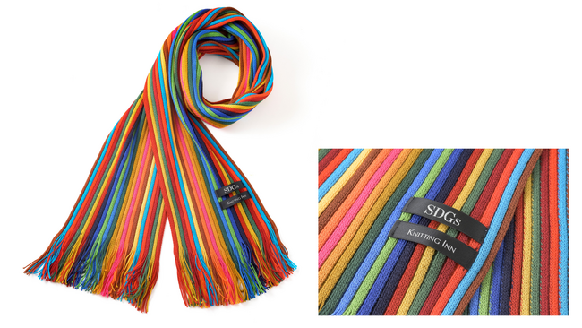 国内外の有名美術館の所蔵画をイメージしたマフラーや国内企業やスポーツチームとのコラボレーションも実現。アニメ「機動戦士ガンダム」カラーのマフラーや、Jリーグやプロ野球チームの商品も手がけていきます。近年では桐生市の団体とコラボしてSDGsカラーのマフラーを販売し、収益の一部は桐生市とみどり市の子ども食堂の支援などに充てています。