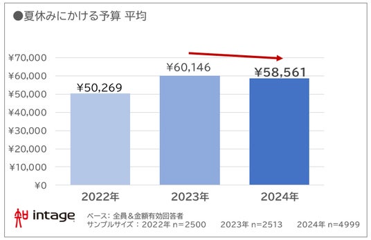 ・今年の夏休みの予算は平均58,561円。昨年は60,146円で前年比1.2倍と大きく増加したものの、今年は微減