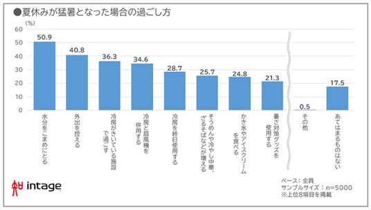 ・「猛暑で予定変更検討」13.5%。過ごし方は「水分をこまめにとる」、「外出を控える」、「冷房がきいた施設で過ごす」上位