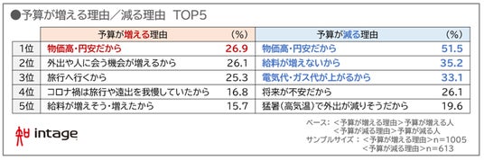 予算が増える理由は「物価高・円安だから」が26.9%で最も高く、「外出や人に会う機会が増えるから」(26.1%)、「旅行へ行くから」(25.3%)が続きます。一方、予算が減る理由も「物価高・円安だから」が51.5%で最も高く、「給料が増えないから」(35.2%)、「電気代・ガス代が上がるから」(33.1%)が続きました(図表2)。