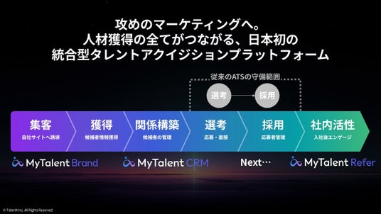 本構想の実現に向け、当社がこれまで提供してきた採用CRM「MyTalent」、採用ブランディングCMS「MyBrand」、リファラル採用プラットフォーム「MyRefer」を統合し、日本初(※1)の統合型タレントアクイジションプラットフォーム「MyTalent Platform」としてブランドを刷新いたします。