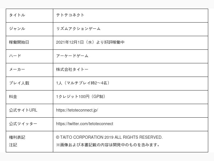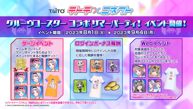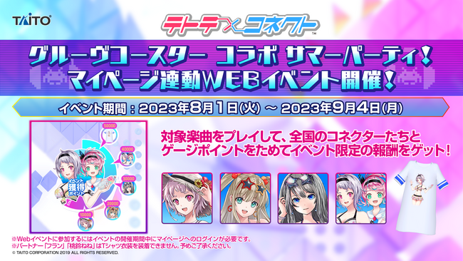 株式会社タイトー(本社:東京都新宿区)は、アーケード用リズムアクションゲーム『テトテコネクト』において、8月1日(火)にアップデートを実施し、『グルーヴコースター』とのコラボレーションとして、限定アイコンや称号、衣装などが手に入るゲーム内イベントを開催する他、『グルーヴコースター』オリジナル楽曲を追加いたします。