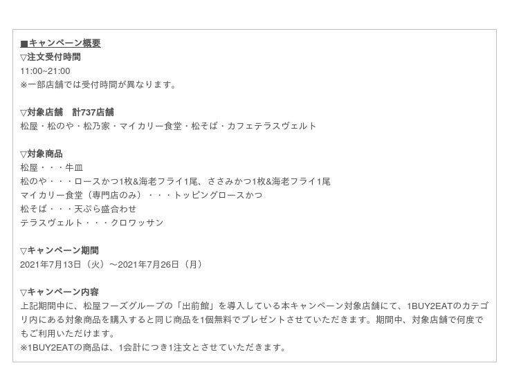 このたび松屋フーズ(本社:東京都武蔵野市、代表取締役社長:瓦葺一利)では、牛めし・カレー・定食・その他丼の「松屋」、とんかつ専門店の「松のや・松乃家」をはじめとする松屋フーズグループの「出前館」を導入している対象店舗におきまして、2021年7月13日(火)から7月26日(月)まで、「出前館1BUY2EAT」を2週間限定で開催いたします。