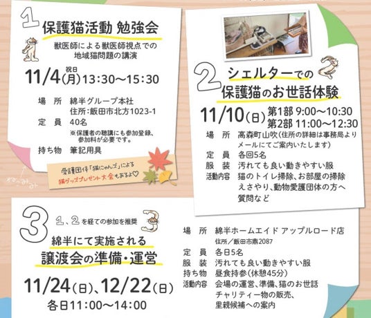 シェルターで保護猫のお世話体験:11月10日(日) 綿半の譲渡会を体験・運営:11月24日(日)・12月22日(日)
